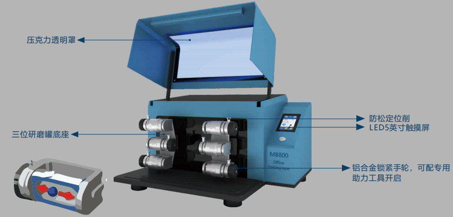 ● 特别设计的研磨罐安全锁紧装置较大程度地保证了研磨罐的紧固安全性;